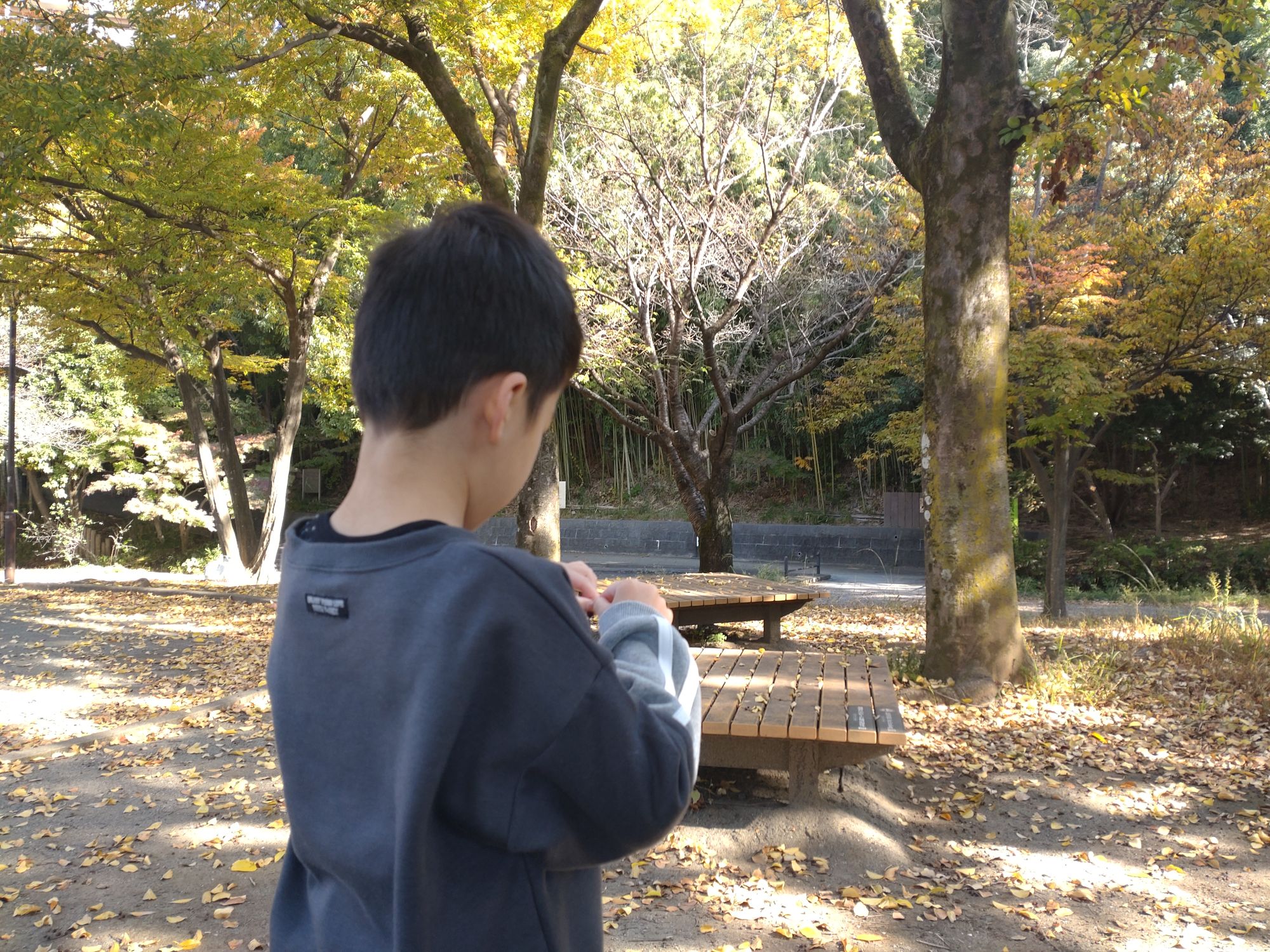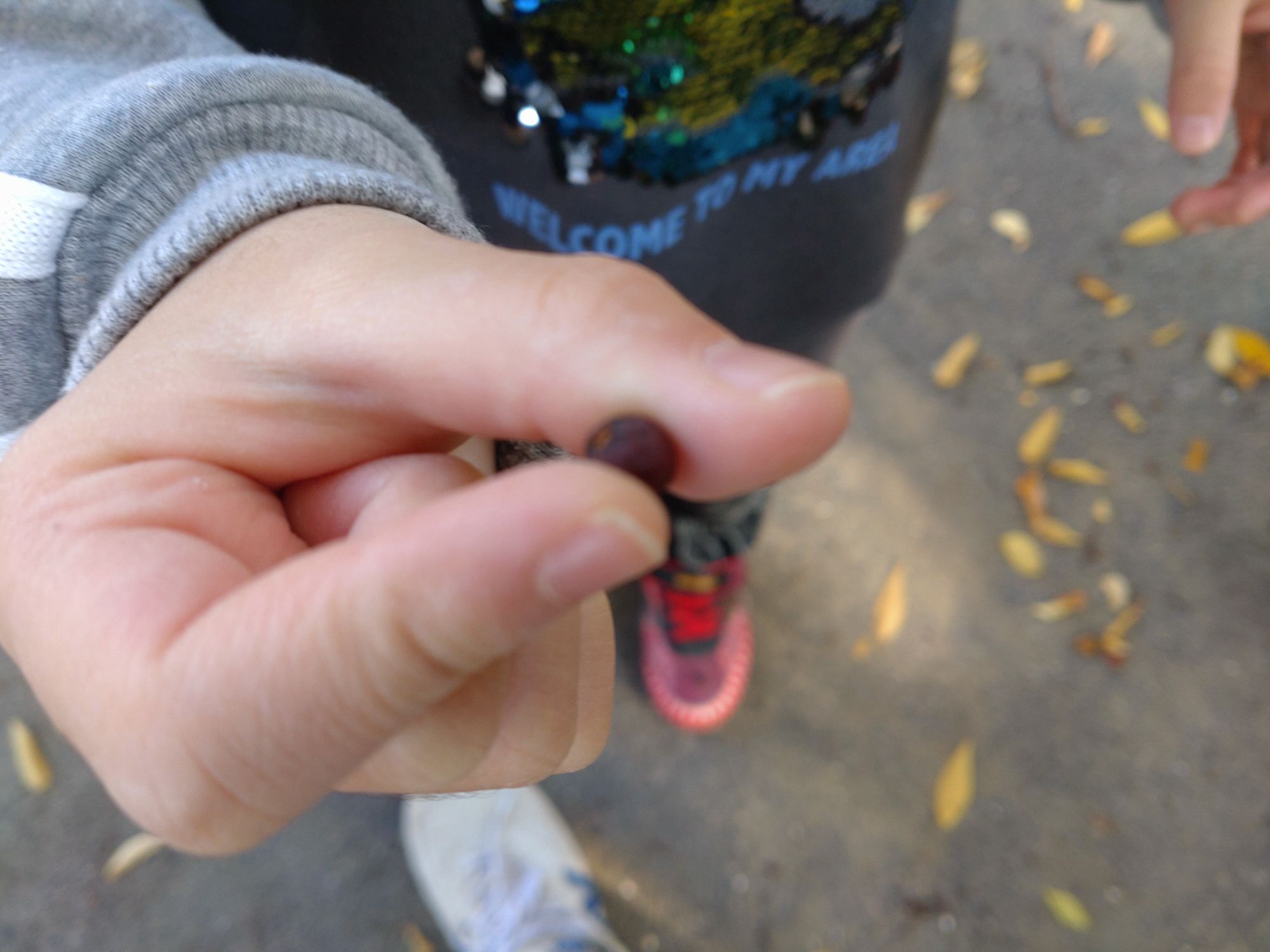 緑道に落ちているどんぐりや木の実、落ち葉を発見しては